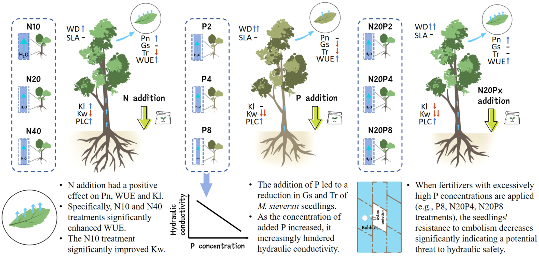 针对上述问题,中国科学院新疆生态与地理研究所张元明研究员团队选择一年生新疆野苹果幼苗为研究对象,在退化最为严重的新源县野果林改良厂对其进行为期4年的养分添加实验,通过研究其气体交换参数、水分传输的有效性和安全性等功能性状对不同水平氮添加(N10、N20和N40)、磷添加(P2、P4和P8)以及氮、磷交互(N20Px和NxP4)的响应特征,并利用植物性状网络分析(PTNs)探究多个性状之间的协调性在不同水平之间的差异,以期确定该区域新疆野苹果幼苗最佳的养分管理措施。