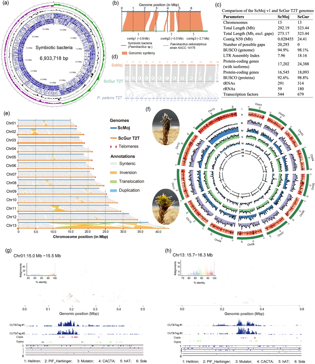 基于其重大的生态和科研价值,中国科学院新疆生地所张道远研究员团队针对上述难题,开发出了古尔班通古特沙漠齿肋赤藓成熟的单克隆组培体系,并利用三代测序技术获取了其内共生菌(类芽孢杆菌)的完整基因组序列,并通过优化的基因组组装策略克服了内共生菌等非核基因组序列干扰的难题,实现了齿肋赤藓13条染色体的完整无缝组装,全基因组最终生成长度为323.44 Mbp,N50为24.41 Mbp,单碱基准确率超过99.999%,是迄今已报道的质量最高的苔藓基因组。