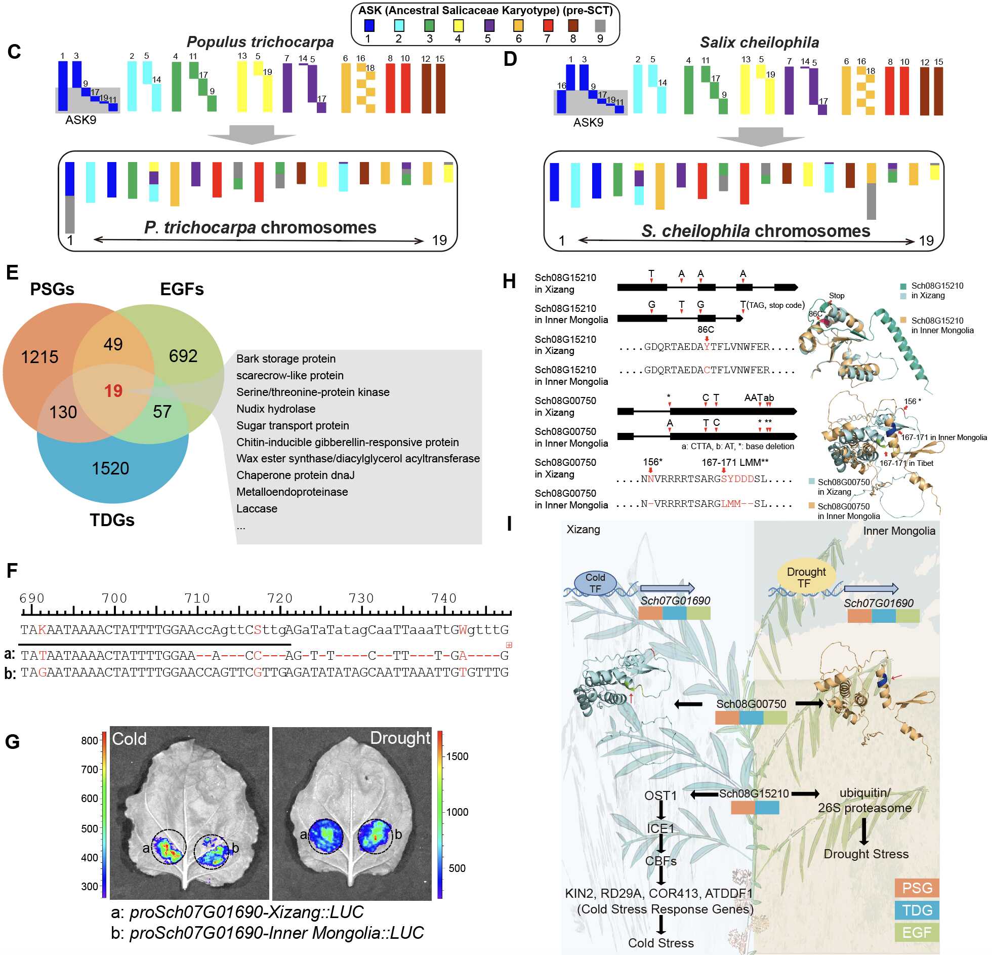 图2:杨属和柳属基因组祖先核型重构和演化路径,以及乌柳高原和荒漠环境适应性演化关键靶点的靶定与功能验证