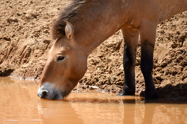 记者看到,两台车刚刚驶离水源地,一匹普氏野马就迫不及待地靠近水洼,专注地喝起水来。
