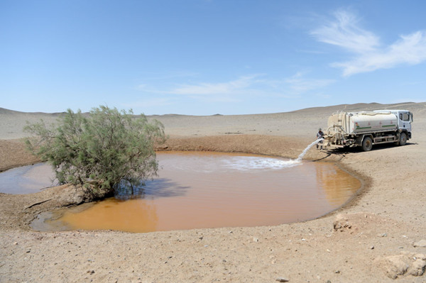 在新疆卡拉麦里山有蹄类野生动物自然保护区,管护员为水源地灌水(6月3日摄)。新华社记者 丁磊 摄