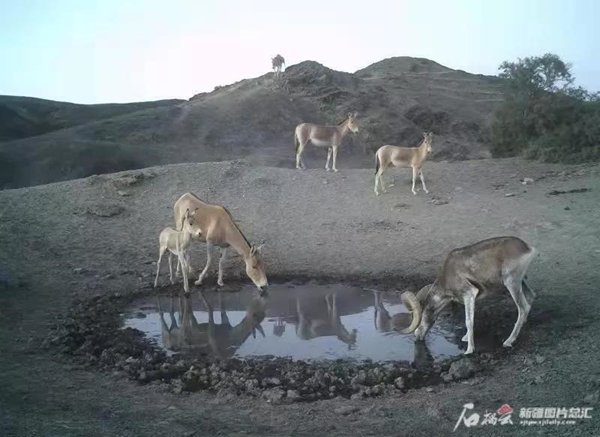 蒙古野驴与盘羊共饮一汪水。(供图:卡山保护区管理中心)