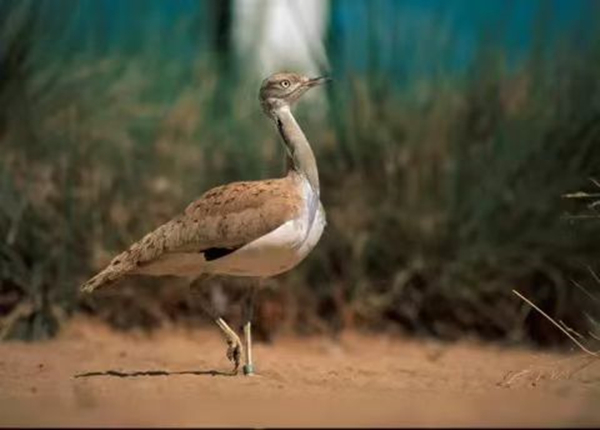 波斑鸨栖息于开阔荒漠或干旱草原,它们背部、翅膀和尾巴上覆羽呈浅沙黄色,和大自然一个色调,像穿着迷彩服一样,起到了“隐身”的作用。由于几乎很少鸣叫,它们又被称为“哑巴鸟”。杨维康说,由于中东国家的富豪喜欢训练猎隼捕猎波斑鸨,所以近年来波斑鸨数量急剧下降。为了保护这种国家一级保护动物,生地所和阿联酋国家鸟类研究中心合作,在新疆木垒进行野外研究和保护。