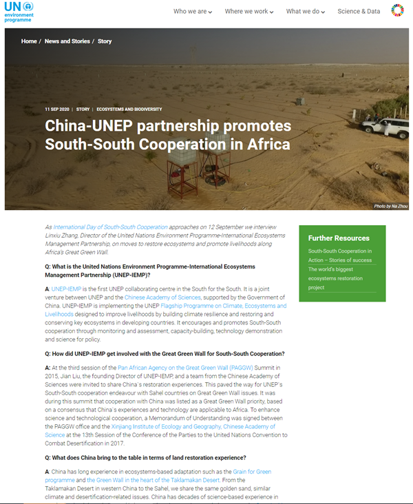 UNEP官网头条“China-UNEP partnership promotes South-South Cooperation in Africa”的报道中提到,新疆生地所多年来在荒漠化防治与生态建设研究领域,取得了一系列研究成果,不仅建成了“塔里木沙漠公路防护林生态工程”,而且携带着相关技术成果走进了遥远的非洲,在泛非绿色长城建设中发挥重要作用。