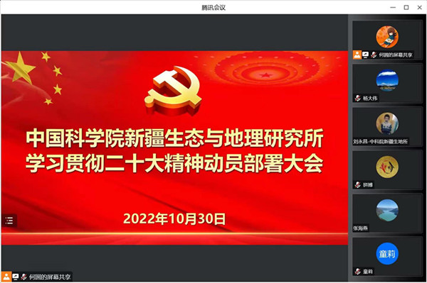 10月30日,中国科学院新疆生态与地理研究所召开学习宣传贯彻党的二十大精神动员部署大会,党委书记、副所长张向军讲专题党课,带头宣讲党的二十大精神,安排部署贯彻落实工作。研究所党委副书记、纪委书记吉力力·阿不都外力主持会议。