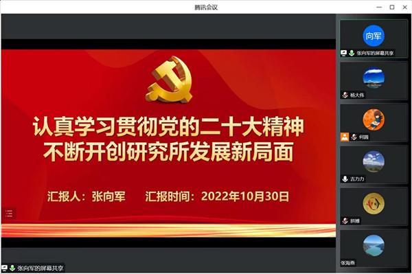 张向军强调,认真学习贯彻党的二十大精神要在全面学习、全面把握、全面落实上下功夫,结合研究所实际,围绕实施“十四五”规划,加强党对科技工作的全面领导,坚决贯彻落实“四定”战略部署,加快推进国重体系重组工作,改革完善科研工作选题机制,积极组织承担国家重大科技任务,提高研究所整体治理能力,着力提高抓落实的能力本领。研究所党委委员要压紧压实抓落实的责任担当,深入支部和部门指导开展二十大精神的学习宣传活动,把学习贯彻情况作为支部年度考核的重要内容,形成一级抓一级、层层抓落实的工作格局,迅速掀起学习宣传贯彻党的二十大精神热潮。