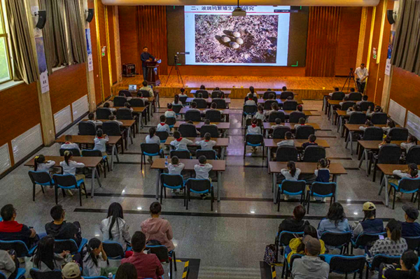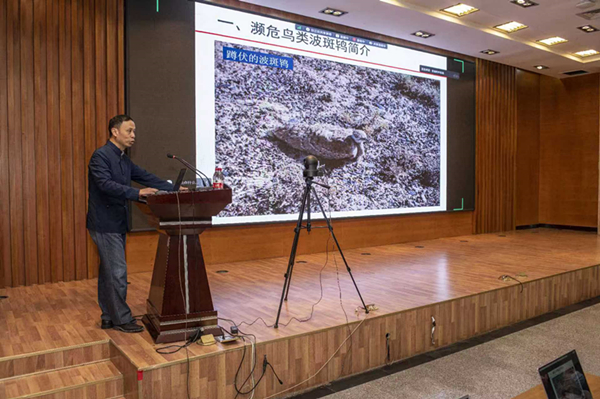 在研究所二楼报告厅举行的“旱域生灵”专场科普报告,是杨维康研究员带来的“美丽的波斑鸨”,他生动地讲述了与团队成员一起保护、研究波斑鸨的故事。