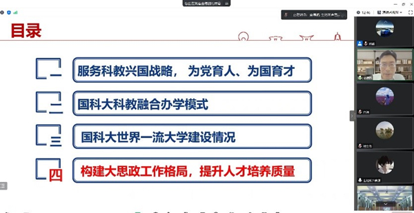 中国科学院大学党委副书记金德鹏教授出席会议并作专题报告。金德鹏教授以《为党育才、为国育才,科教融合推进世界一流大学建设,服务全面建设社会主义现代化国家新征程》为题作报告,强调服务科教兴国战略,为党育才、为国育才的重要性,介绍了国科大科教融合的办学模式,通报了国科大世界一流大学建设的情况,并提出了构建大思政工作格局,提升人才培养质量的明确要求。