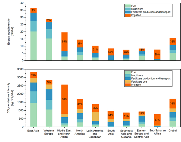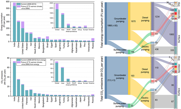 灌溉农业贡献了全球粮食产量的40%,但其用水量却占全球用水总量的70%,而灌溉抽水过程往往伴随着能源消耗和温室气体排放。随着全球灌溉用水需求的增加、化石燃料的枯竭以及环境问题的日益突出,灌溉农业水-能-碳纽带关系日益趋紧,为了保障全球粮食安全需迫切对灌溉农业水-能-碳纽带关系进行全面的解析,并寻找实现灌溉农业可持续发展的路径。然而,目前大量研究集中在全球灌溉用水量的定量评估方面,缺乏对全球灌溉能源消耗和碳排放环节的全面认识,限制了对灌溉农业水-能-碳纽带关系的揭示。此外,由于高分辨率数据的缺乏以及关键参数估算的复杂性,以往研究很少对全球灌溉用水能源消耗和碳排放进行定量化评估,导致目前尚不清楚全球灌溉用水消耗了多少能源、排放了多少二氧化碳。同时,灌溉所产生的碳排放对农业温室气体排放的贡献,以及其在全球气候减缓努力中的作用,在很大程度上仍是未知的。