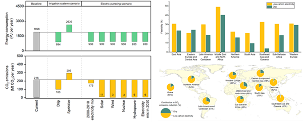 图1 全球灌溉能源消耗和碳排放量(左)及其在不同灌溉水源、灌溉系统和泵送系统中的分布(右)