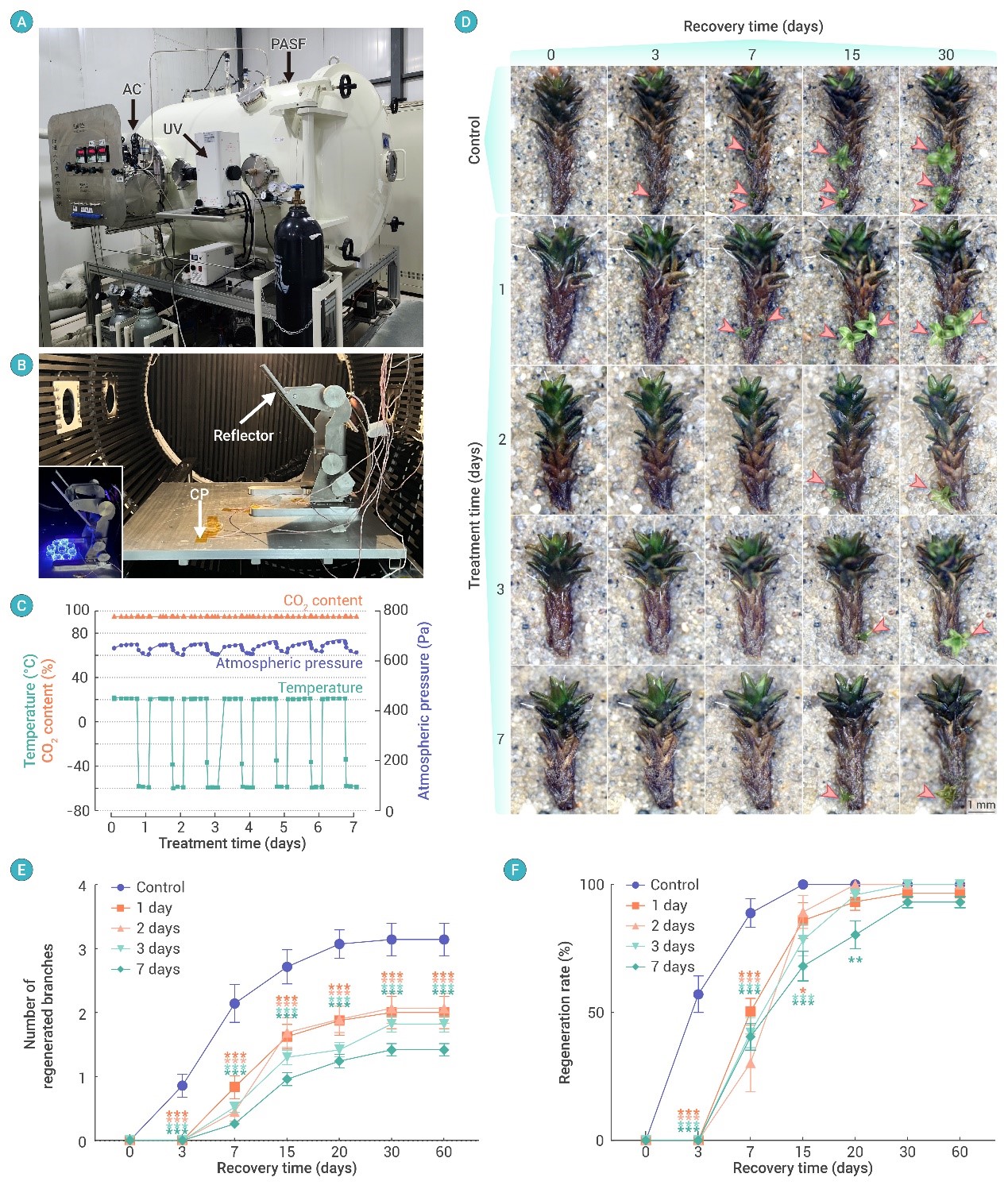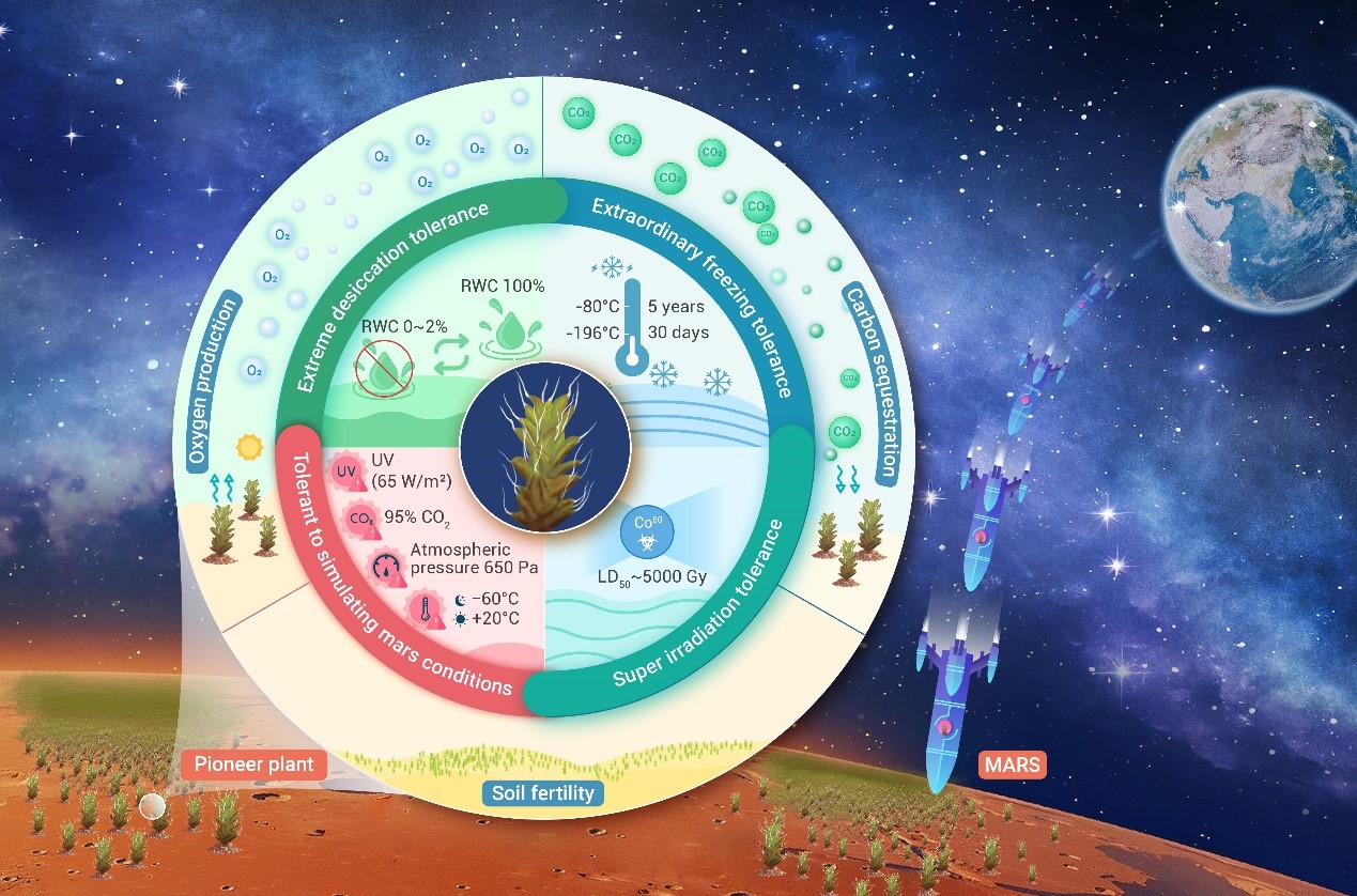 中国科学院新疆生态与地理研究所张道远研究员和张元明研究员团队聚焦于一种沙漠苔藓—齿肋赤藓(Syntrichia caninervis),揭示齿肋赤藓的生存极限及适应策略,研究表明该藓能耐受自身98%以上的细胞脱水、-196°C超低温速冻、5000 Gy以上伽马辐照而不死,且在火星模拟条件(650±30 Pa,-60°C ~20°C,95%CO2,多种UV辐射)下仍能存活并再生出新的植株。这一研究刷新了极端生命体对环境的“耐受”新记录,为人类探索外太空、打造宜居星球提供灵感,并为开拓地外新家园提供理想“利器”。