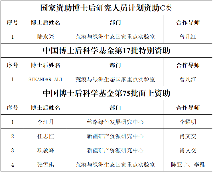其中,入选国家资助博士后研究人员计划C档1项(全疆共6项),入选第17批特别资助1项(全疆共3项)、第75批面上资助4项(全疆共8项)。新疆生地所获批博士后名单如下: