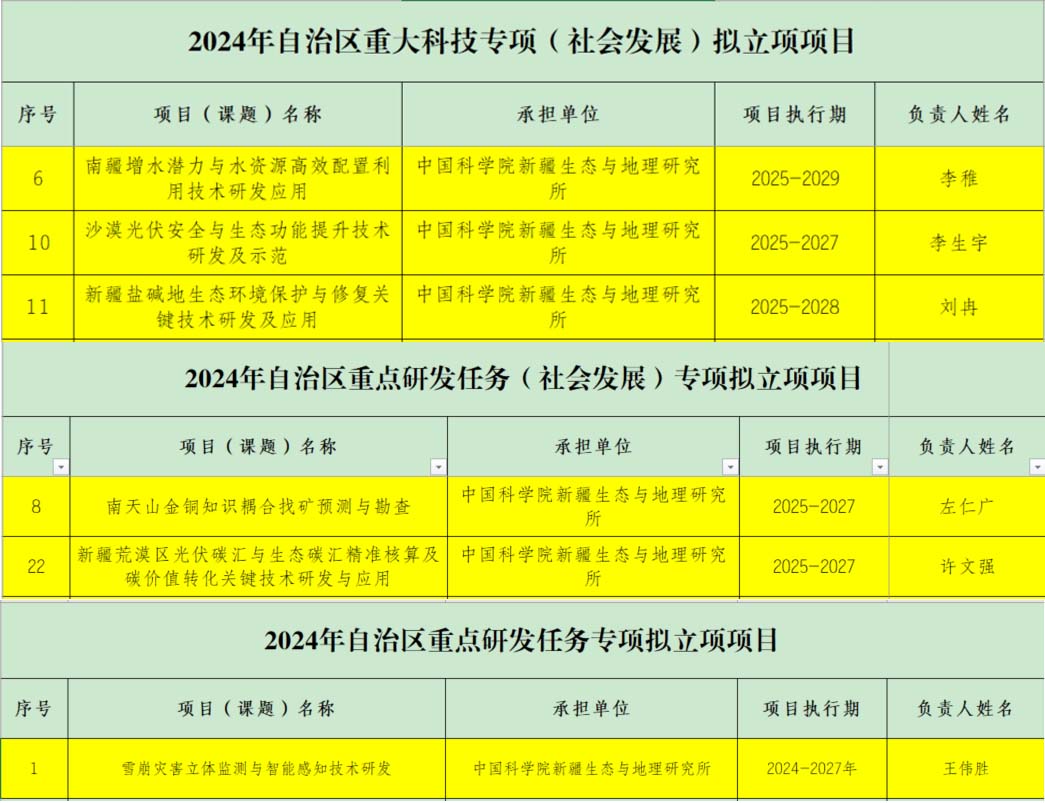 近期,新疆维吾尔自治区科学技术厅公布了《关于对2024年自治区重大科技专项等3个科技计划拟立项项目进行公示的通知》,中国科学院新疆生态与地理研究所获批自治区重大科技专项(社会发展领域)项目3项,分别是“南疆增水潜力与水资源高效配置利用技术研发应用”“沙漠光伏安全与生态功能提升技术研发及示范”“新疆盐碱地生态环境保护与修复关键技术研发及应用”;自治区重点研发任务专项(社会发展领域)项目3项,分别是“南天山金铜知识耦合找矿预测与勘查”“新疆荒漠区光伏碳汇与生态碳汇精准核算及碳价值转化关键技术研发与应用”“雪崩灾害立体监测与智能感知技术研发”。同时还获批参与其他两重项目的重大专项课题2项、重点研发课题3项。