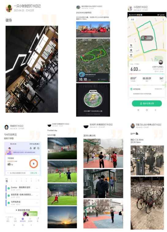 在本次活动中,老师和同学们寻找适合运动的场所,开展各类运动项目,活动的种类丰富,有徒步、跑步、慢跑、健身、瑜伽、球类运动等。活动中老师和同学们使用keep、qq运动等手机应用进行跑步、走路的计时最后将记录上传至小程序打卡,或者进行健身、打篮球等其他运动并通过小程序上传照片进行打卡。本次活动起到了监督打卡的作用,也给同学们增强运动的动力,本次活动共98人参加,852条打卡记录。