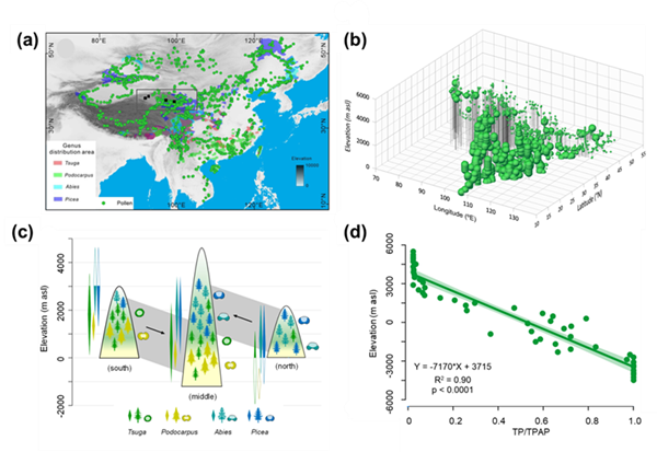 图1. (a) 现代大空间3088个表层样品孢粉中四类孢粉与母体植物(铁杉属、罗汉松属、冷杉属和云杉属)的空间分布; (b) TP/TPAP (铁杉属%+罗汉松属%) /(四类针叶树总和%) 比值的空间分布; (c) 四类孢粉与母体植物海拔矫正示意图; (d) 以海拔200米为间隔的TP/TPAP比值平均结果与中值海拔定量关系。