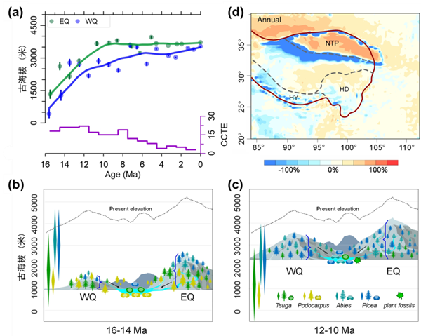 图2. 青藏高原东北部基于孢粉方法的古海拔重建及其气候效应。(a) 以100万年为时间间隔的平均古海拔连续演化历史(蓝色和绿色点与线)及其与青藏高原北部地区构造事件发生数目 (CCTE) (紫色线)的对比;(b)-(c) 1600-1400万年前和1200-1000万年前柴达木盆地及毗邻山体古海拔和植被-孢粉分布场景恢复示意图; (d) RegCM4.6模型数值模拟结果显示高原东北部古海拔下降导致的高原南北和周边降水异常,其中高原东北部、亚洲内陆变干,周边山地变湿,高原东南部、南部变湿。紫红线表示青藏高原轮廓,虚线表示青藏高原东北部 (NTP)、喜马拉雅山 (HY) 和横断山脉 (HD) 边界。