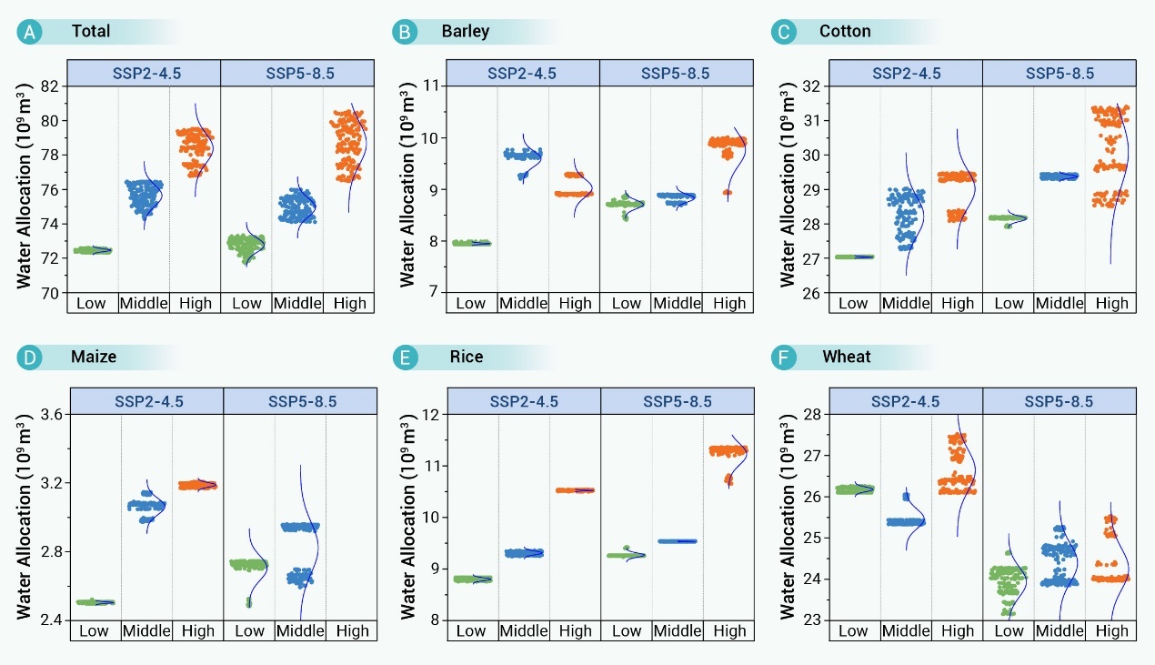 图2:不同社会经济与来水情景下的咸海流域主要农作物配水量