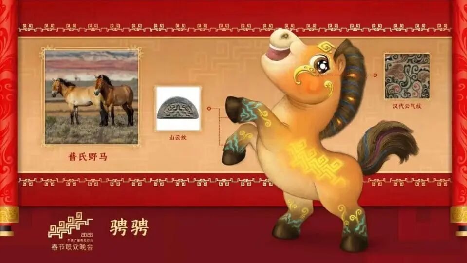 驰骋踏新程,中央广播电视总台《2026年春节联欢晚会》四匹骏马的吉祥物形象活泼可爱、意气风发。与“骐骐”“骥骥”“驰驰”设计灵感源自文物不同,“骋骋”的原型是普氏野马——世界上现存的唯一野生马种,拥有6000万年进化史的“生物基因活化石”。